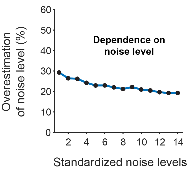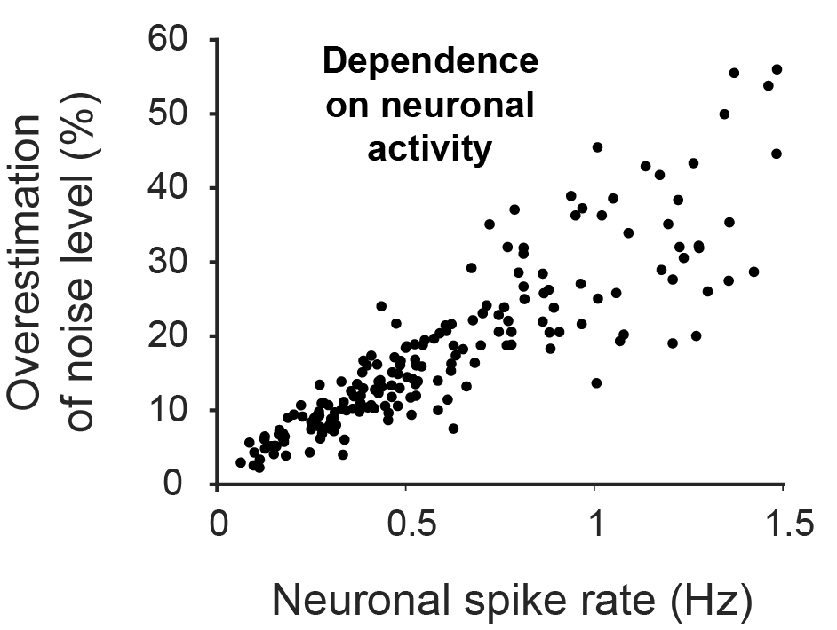 First, the metric generally overestimated the true noise level by about 20%. This overestimation was largely independent of the noise level but slightly increased for lower noise level. This makes sense: the relative effect of the same amount of a fixed level of neuronal activity is greater when the baseline noise is zero. However, the overall effect was relatively small – 20% is not dramatic for such a coarse metric: