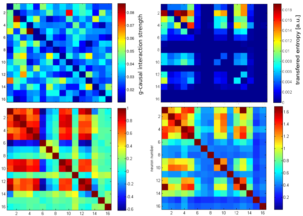 Additionally, it is clearly visible that if the data do not yet show a clear causal relation (or are even generated using a simulated deterministic network), it is hard to discriminate causality from correlation and from noise. For scientific analysis, in my opinion, 1) deeper understanding of the data, of the binning, and of the algorithm is required, 2) better data is helpful and 3) a good intuition is essential of what really happens in the network and at which connections it is worth looking more precisely.