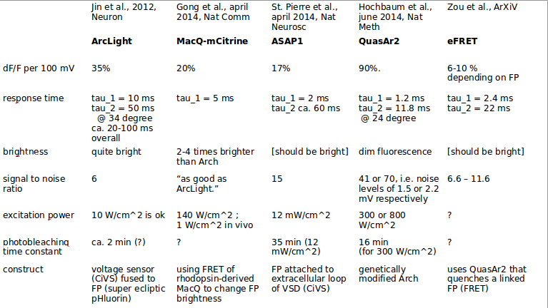 As a reference, I chose the construct ArcLight (Jin et al., 2012, Neuron, Link), because this was also taken as reference by most of the following papers. The recent constructs I had a look at were MacQ-FP (Gong et al., 2014, Nat. Comm., Link), ASAP1 (St. Pierre et al., 2014, Nat. Neuroscience, Link), QuasAr2, which is backed by a long list of co-authors, (Hochbaum et al., 2014, Nat. Meth., Link) and a method closely related to MacQ-FPs and based on QuasAr2, eFRET (Zou et al., 2014, arXiv, Link).
