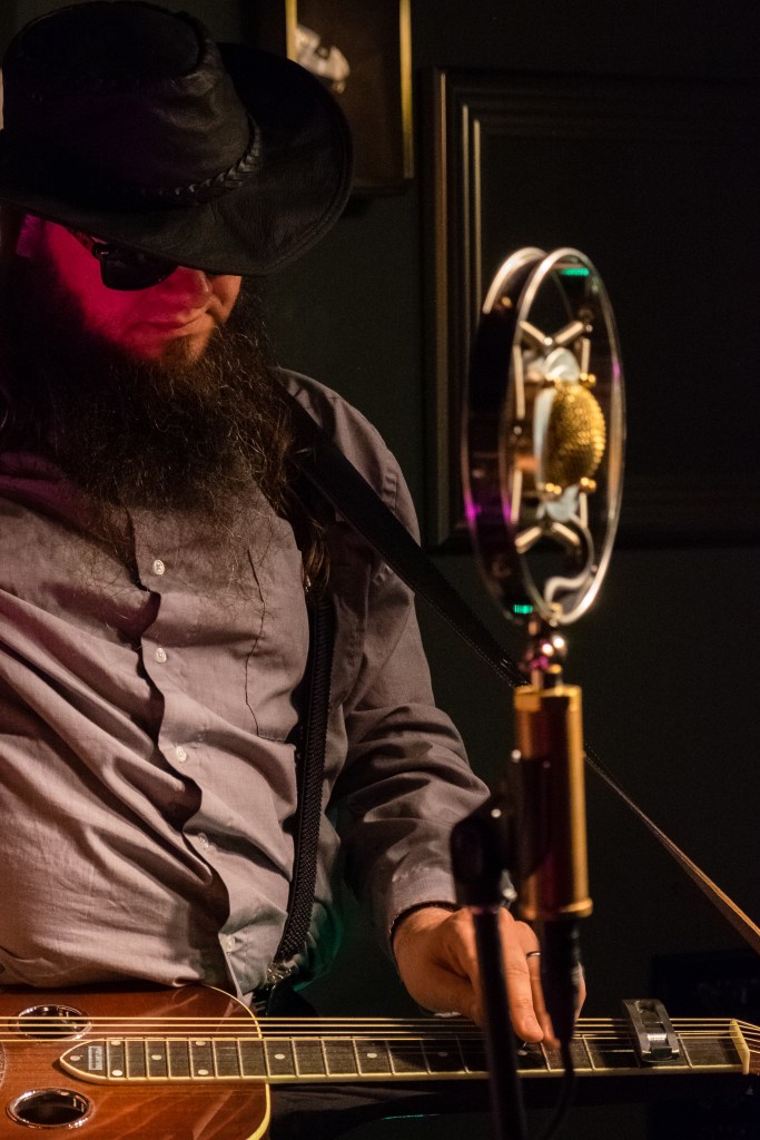 BP: A Dobro is an American instrument, it’s like an acoustic guitar that has an aluminium resonator cone built into the body. Originally, it was invented to make a normal guitar louder, a bit like a speaker cone that picks up the vibrations from the strings and projects them outward. The Dobro was invented in the 1920s to make the guitar a little bit louder to be heard over orchestras, and it was kind of popular for a few years, until someone invented an electric guitar that you could just very easily make a lot louder, and then the Dobro fell into obscurity. It’s played in a lap style, and you’re not fretting the strings with your fingers like on a normal guitar, but you use a steel bar that slides up and down the strings.