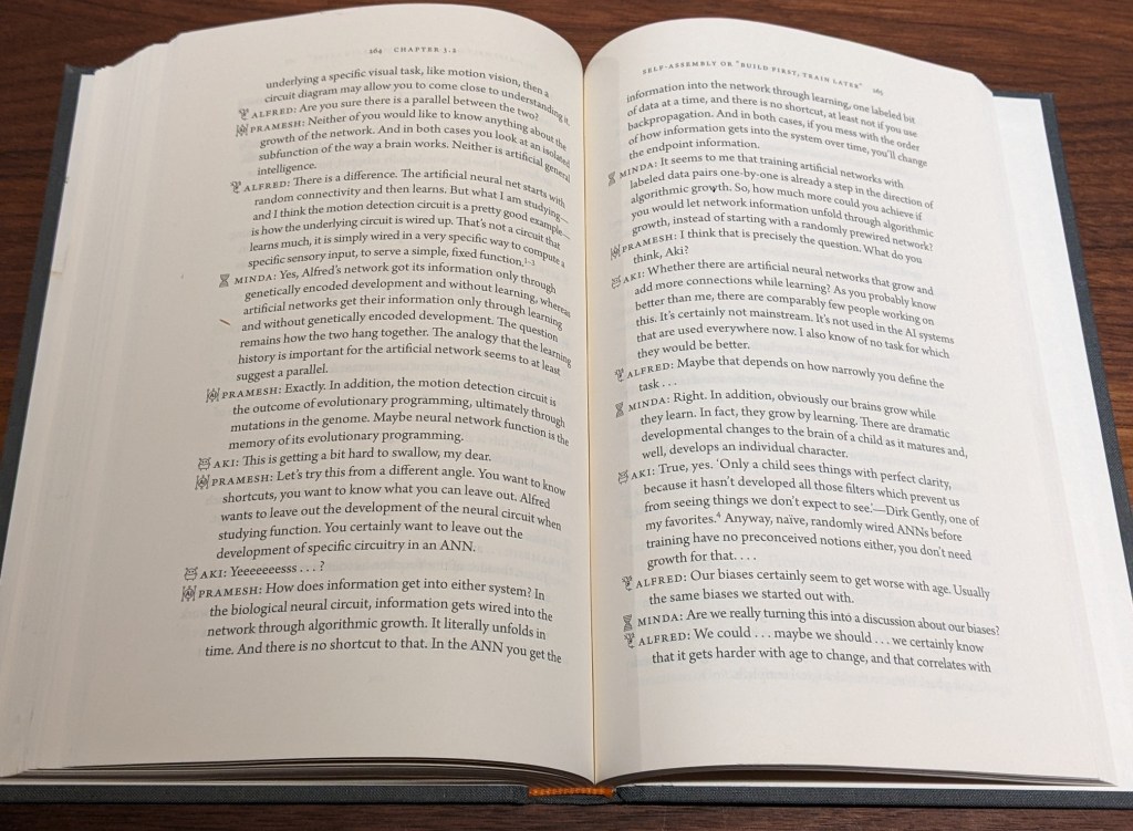The book is structured into ten “seminars”, which are each of them a slightly confusing mix of book chapter and lecture style. Each of the “seminars” is accompanied by a staged discussion between four actors: a developmental biologist, an AI researcher, a circuit neuroscientist and a robotics engineer (see the photo above). Theoretically, this is a great idea. In practice, it works only half of the time, and the book loses a bit of its natural flow because the direction is a bit missing. However, these small drawbacks are acceptable because the main ideas are interesting and enthusiastically presented.