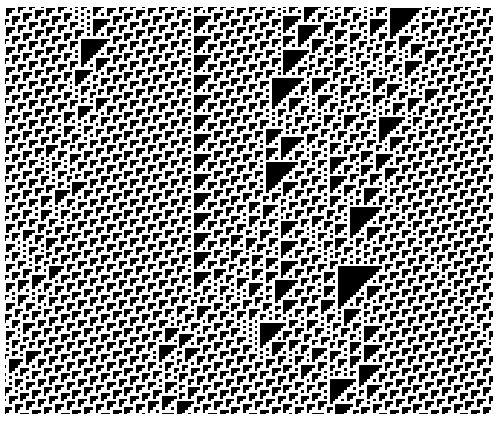 Second, Hiesinger connects the unfolding idea with the field of cellular automata, and in particular with the early work of Stephen Wolfram, a very influential but also controversial personality of complexity research, and his cellular automaton named rule 110. The 110 automaton is a very simple rule (the rule is described in this wikipedia article) that is applied to a row of 1’s and 0’s and results in another binary row. The resulting row is again subject to rule 110, etc., leading to a two-dimensional pattern as computed here in Matlab: