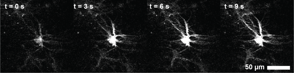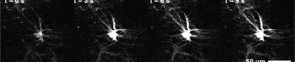 Figure 1. A reactive astrocyte with many long protrusions is activated by laser light. Different from typical astrocytic activation (see below), calcium does not propagate from distal to central compartments.