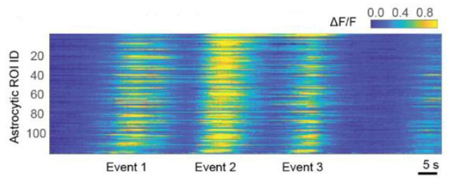 A few days later, I went back to the analysis of astrocytic calcium imaging data from hippocampus, and to the analysis of single-cell activity. Out of curiosity, I checked for sequential activity patterns by sorting the traces according to their peaks. Indeed, I found a clear sequential activation pattern across astrocytes (Figure 4).
