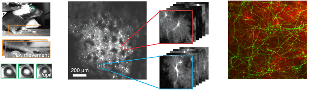 Project: You will be supervised by Dr. Peter Rupprecht and Prof. Fritjof Helmchen at the Brain Research Institute, University of Zurich. The project will be to study animal behavior in mice (left) together with the dynamics of subcellular calcium signals in neurons and astrocytes (middle), and how they are controlled by axonal projections from the brainstem (right). The activation of astrocytes is important for arousal and stress and therefore also for stress-related disorders. You will study the biological principles underlying subcellular activation of astrocytes, building upon previous work (Rupprecht et al., Nat Neuro, 2024). In a second branch of the project, you will study the role of astrocytes for memory consolidation and neuronal oscillations in a joint project with an optics engineer in the lab. Of course, there will always be possibilities to adapt projects to your specific skills.