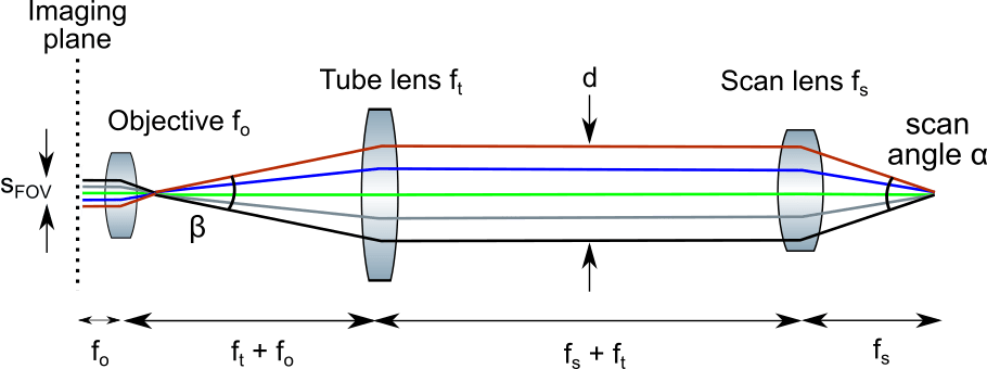 The deflection angle range of the beam, α, is de-magnified by the scan lens/tube lens system to the smaller angle β and then propagates to the objective. The top-bottom spread of the scanned beams on the left indicates the size of the FOV. Using simple trigonometry based on the angle and the distances of lenses to their focal point, one can state (but see also Fabian’s comment below the blog post):