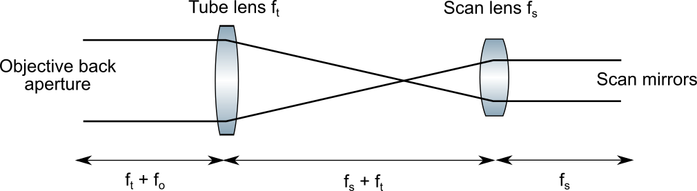 Interestingly, the FOV size depends linearly on the ratio fs/ft. As we have seen above, the beam diameter at the back aperture of the objective depends linearly on ft/fs, the inverse. This results in a trade-off, such that, when you try overfill the back aperture by increasing ft/fs, you will automatically decrease the maximal FOV size. It is therefore important to know beforehand what is more important, high NA (and therefore resolution) or a large FOV size. This is not only but to some extent already determined by the choice of scan lens and tube lens.